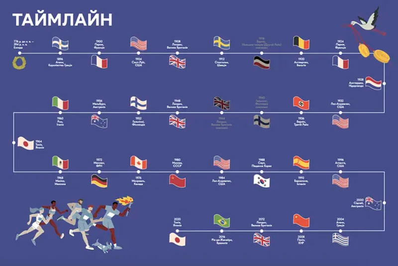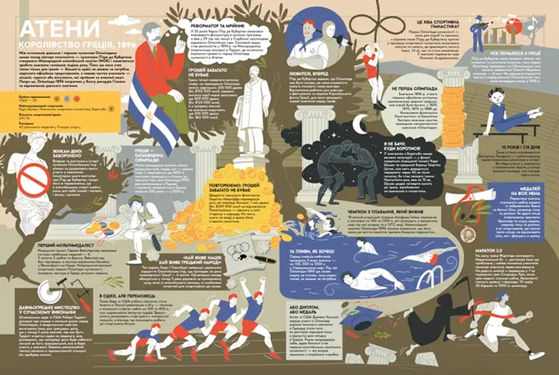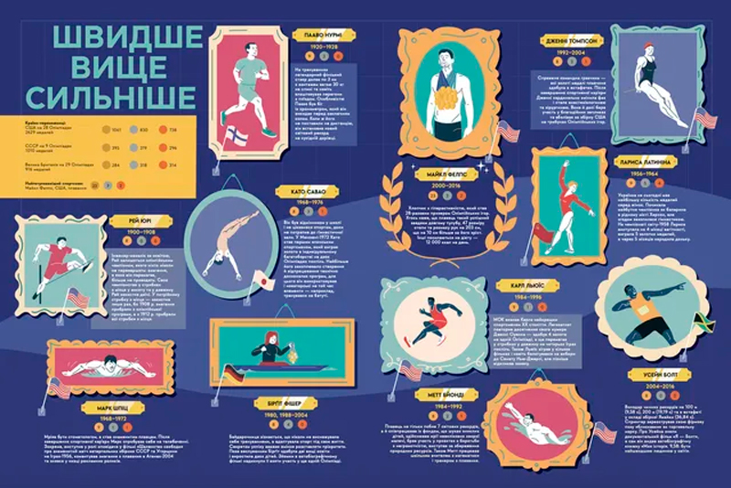 Кожний розворот — це ретроспектива літніх Олімпійських ігор від античності до сучасності. Тож пристібаємо паски, щоб разом «Швидше, вище, сильніше» стрибнути до машини часу і на власні очі побачити, як Олімпіада об’єднувала п’ять континентів своїми кільцями в той час, коли руйнувалися імперії та змінювався світ. Згадаймо видатні постаті, невдачі, сльози, бойкоти, конфлікти, успіхи та рекорди. Сімсот фактів розкажуть більше, ніж про спорт. Вони розкажуть про нашу з вами історію.